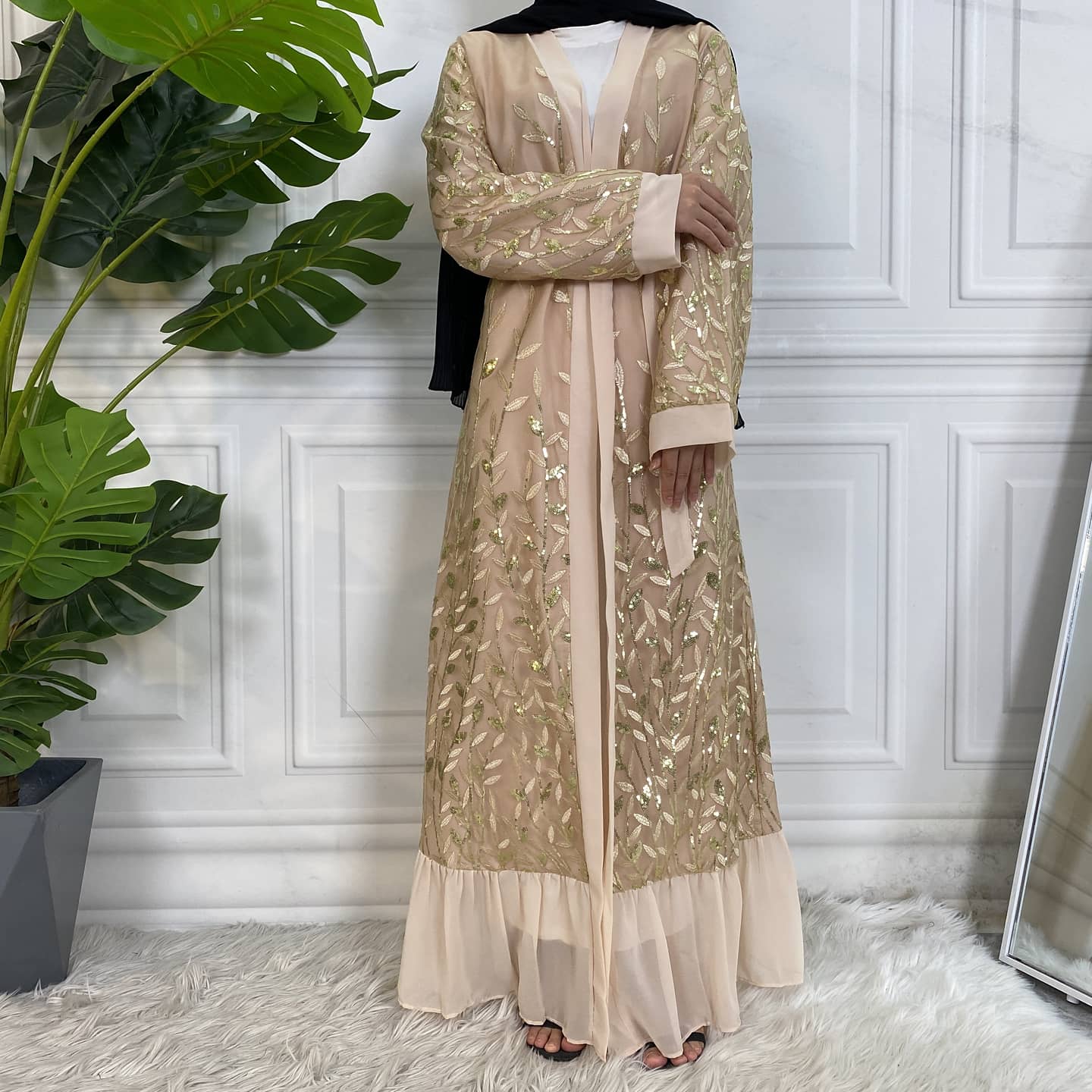 The classy Kinza abaya is a must have in any modest wardrobe. This stunning piece has a beautiful, elegant sequin bodice with chiffon ruffle trim along the bottom hem making it perfect for any occasion.