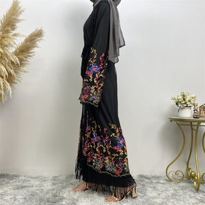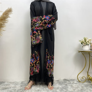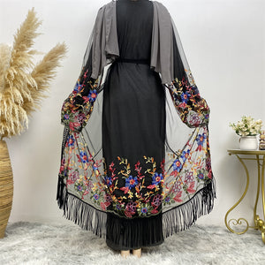 The luxury embroidered net Laiba open abaya is a must have in any modest wardrobe. This unique piece has a beautiful embroidered floral design on the sleeves and front and back hem. The stunning flowy net fabric and fringed hem adds opulence and class making it perfect for a special occasion.