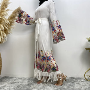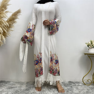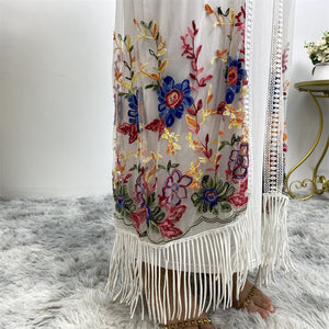 The luxury embroidered net Laiba open abaya is a must have in any modest wardrobe. This unique piece has a beautiful embroidered floral design on the sleeves and front and back hem. The stunning flowy net fabric and fringed hem adds opulence and class making it perfect for a special occasion.