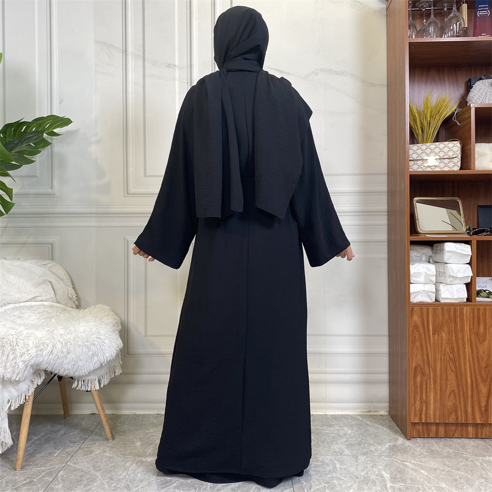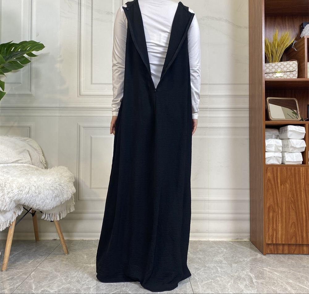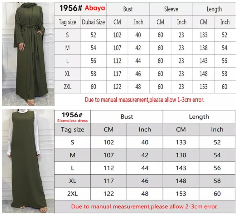 Package includes: x1 outer abaya, x1 matching sleeveless inner slip dress, x1 matching fabric belt