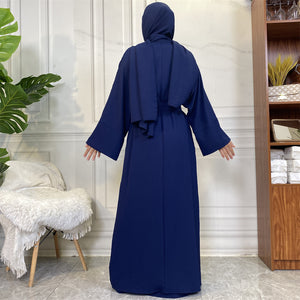 Package includes: x1 outer abaya, x1 matching sleeveless inner slip dress, x1 matching fabric belt