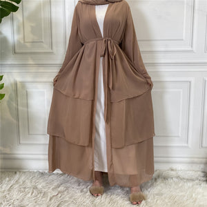 The elegant Malaika abaya is a timeless 3 tier open abaya. This stunning piece has a beautiful sleek layered look with drapes of classy, flowy chiffon making it perfect for any occasion.