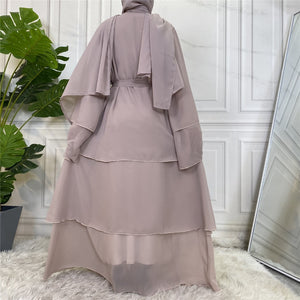 The elegant Malaika abaya is a timeless 3 tier open abaya. This stunning piece has a beautiful sleek layered look with drapes of classy, flowy chiffon making it perfect for any occasion.